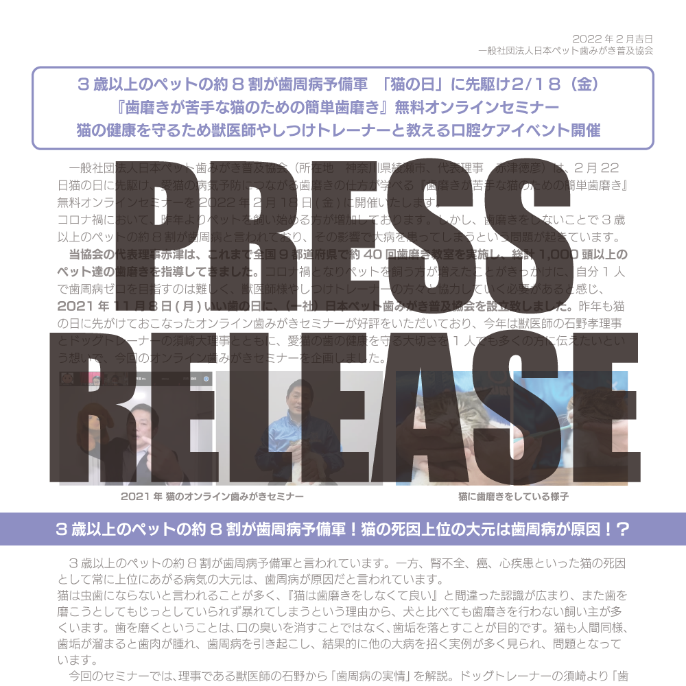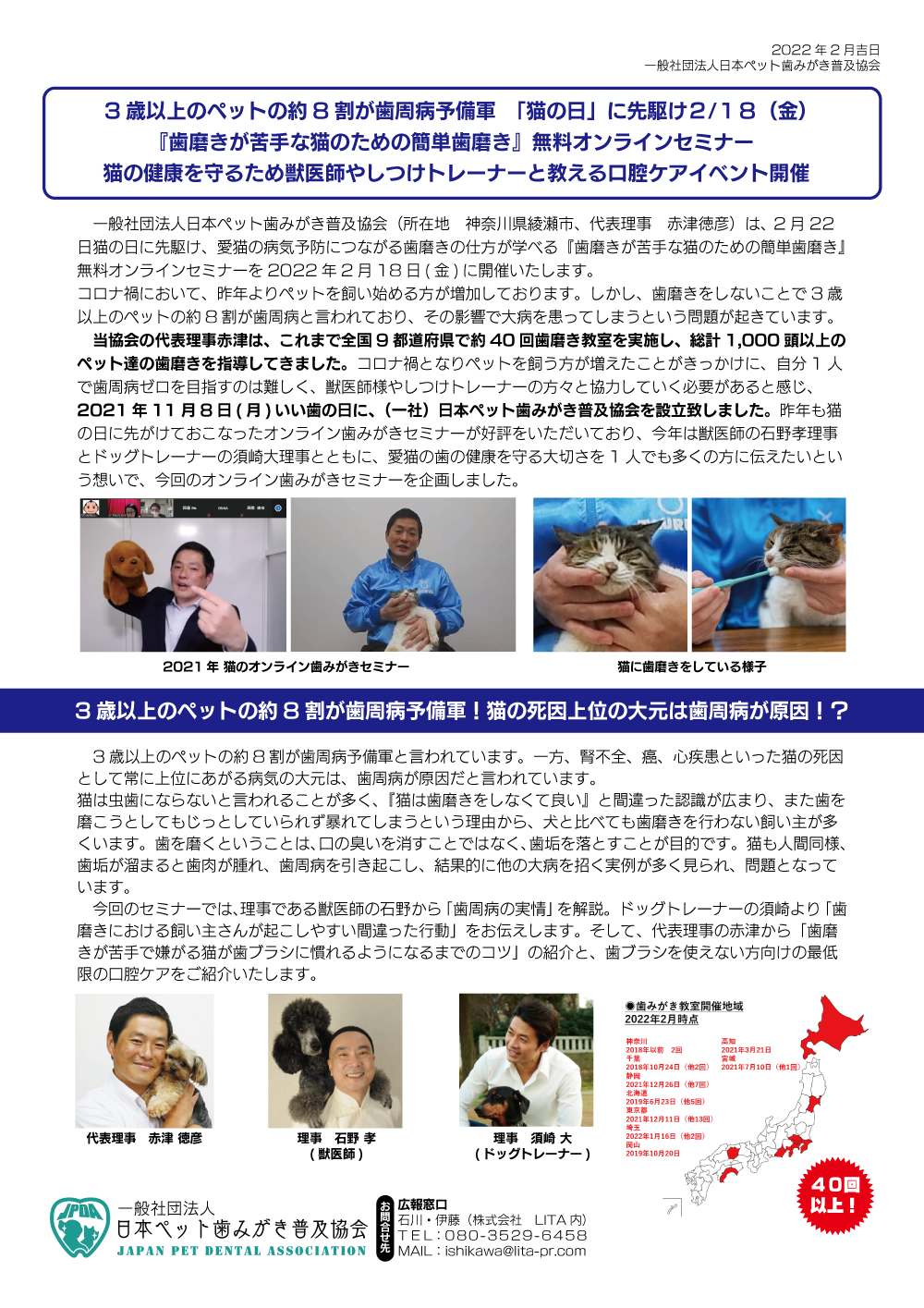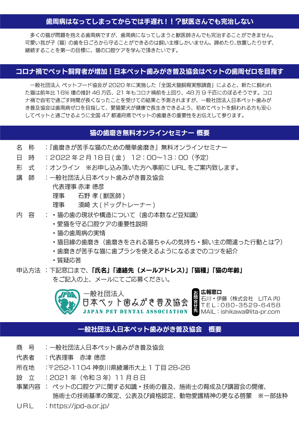 2月18日金曜日12:00〜13:00の日程で『猫ちゃんのオンライン歯みがきセミナー(無料)』を開催します。