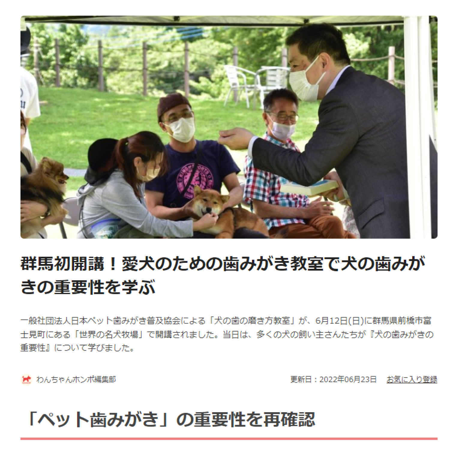 6/12群馬県前橋市にある『世界の名犬牧場』で開催された『犬の歯の磨き方教室』が、わんちゃんとの暮らしをサポートする犬の専門情報サイト「わんちゃんホンポ」で紹介されました。